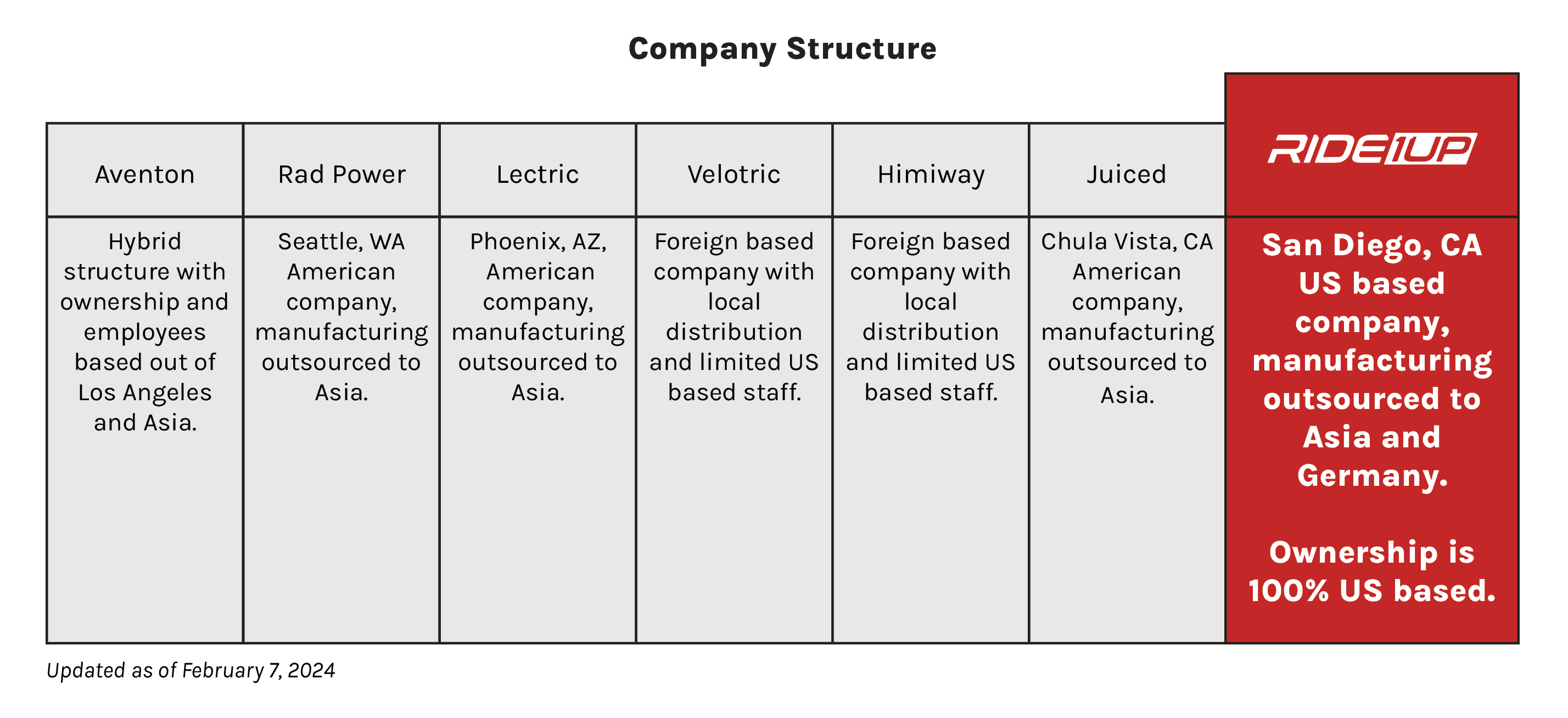 In conclusion, Ride1Up is a domestically based company. We have a variety of operational, logistical, and marketing advantages that translate to a better experience for you, our customer, and contribute to the overall success and competitiveness of our business in the domestic USA.